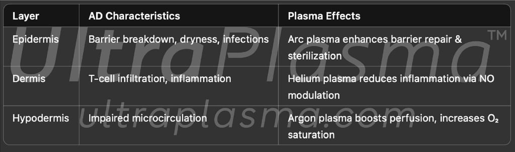 Atopic Dermatitis is a chronic, inflammatory skin disorder marked by epidermal barrier dysfunction, immune dysregulation, and altered dermal microbiome. UltraPlasma™ multi-platform plasma therapy system, offers a novel, non-invasive approach by utilizing arc, argon, and helium plasmas to restore barrier integrity, reduce microbial burden, and modulate inflammatory responses. This article discusses the biochemical, immunological, and physiological effects of UltraPlasma™ treatment on the skin layers and associated gas dynamics including ozone (O₃), nitric oxide (NO), and oxygen (O₂) micro-environments.