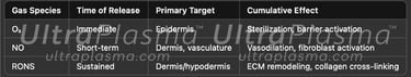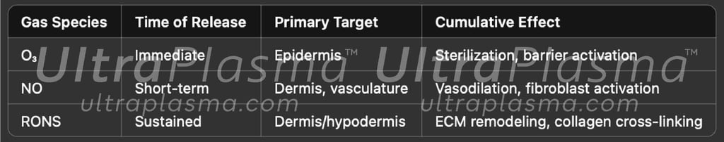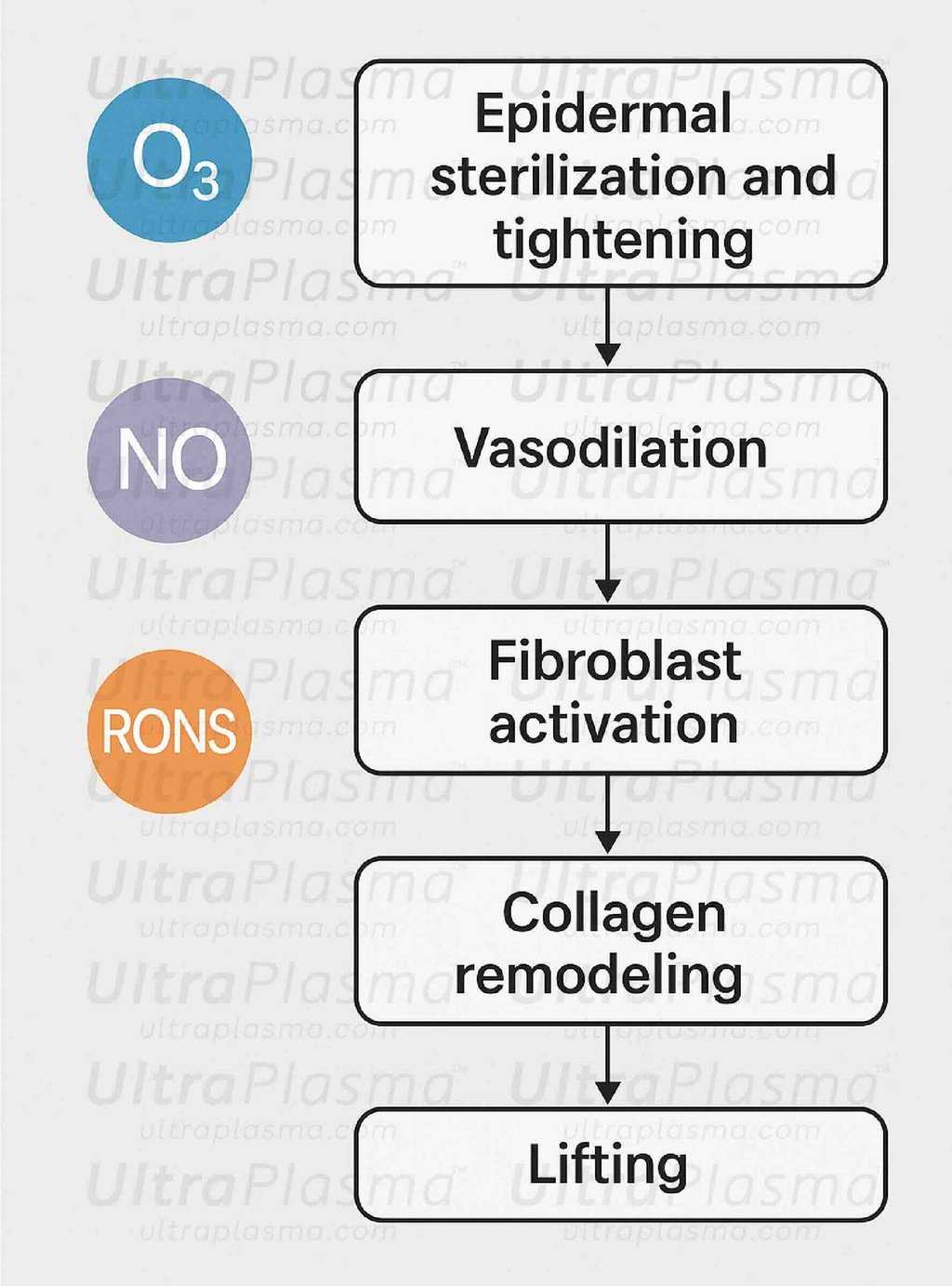 Plasma treatment not only delivers controlled thermal or electromagnetic energy but also acts as a source of biologically active gases that interact with cells, extracellular matrix (ECM), and vasculature. UltraPlasma™ technology is particularly effective due to its engineered capability to regulate these plasma-generated gases for therapeutic effects at multiple skin depths. This section outlines the key gas species involved and their specific bioactivity in skin tightening, tissue regeneration, and lifting applications.