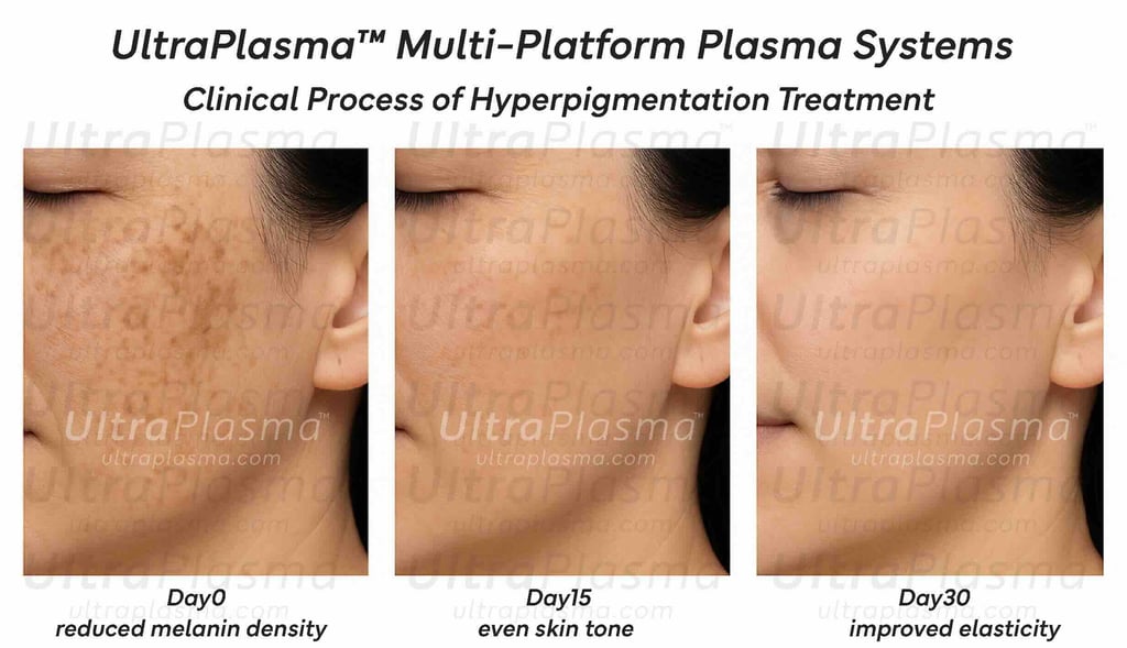 Hyperpigmentation refers to the excessive darkening of the skin due to increased melanin production or deposition. It includes conditions such as melasma, solar lentigines, and post-inflammatory hyperpigmentation (PIH). Traditional treatments—topicals, chemical peels, and laser therapy—often fall short due to limited penetration, inflammation risk, or relapse. UltraPlasma™, a multi-platform plasma device, employs arc, argon, and helium modalities to precisely target melanin-rich layers, improve cell turnover, and remodel extracellular matrix via gas-mediated pathways.