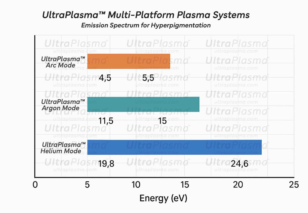 Hyperpigmentation represents a broad dermatological condition characterized by melanin accumulation within different skin layers. Effective treatment requires technologies that can penetrate precise skin depths, stimulate melanocyte regulation, and promote dermal remodeling. UltraPlasma™ technology—integrating arc, argon, and helium plasma emissions—offers a unique therapeutic approach. This paper explores the anatomical mechanisms, bioengineering principles, and clinical applications of UltraPlasma™ for hyperpigmentation, focusing on epidermis, dermis, and hypodermis interactions, with detailed discussions on gas-phase chemistry involving ozone (O₃), nitric oxide (NO), and reactive oxygen/nitrogen species (RONS). Figures illustrate emission profiles, skin penetration zones, biochemical flowcharts, and clinical outcomes.